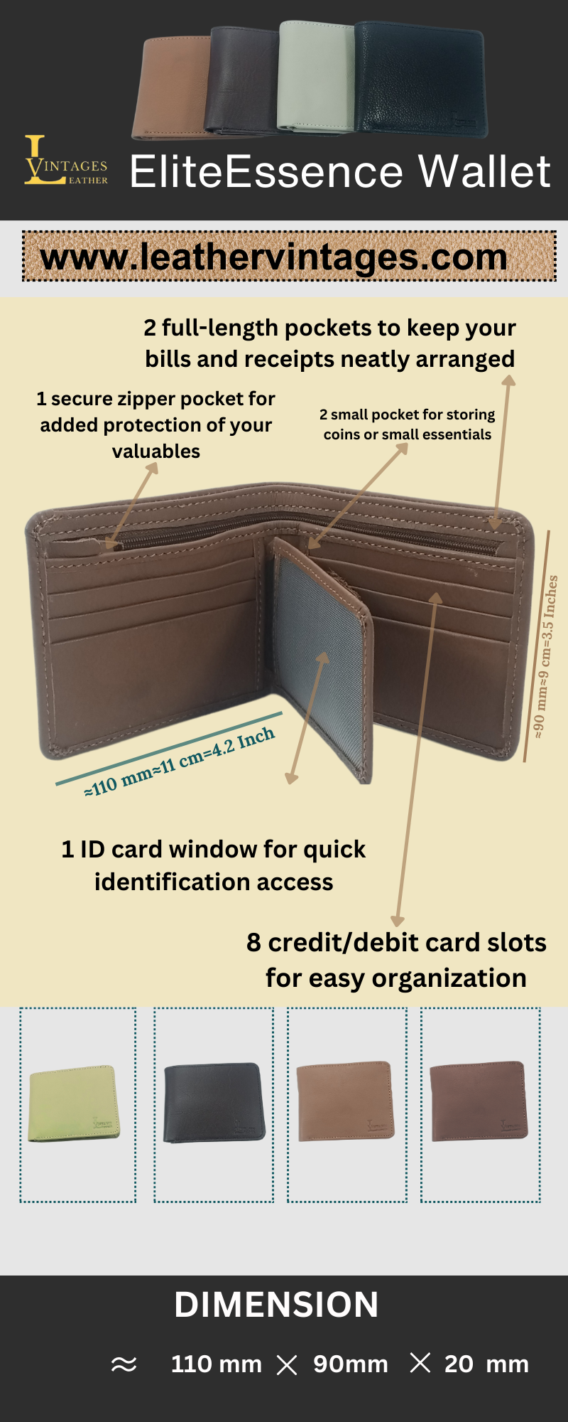 Introducing our sleek and versatile wallet designed for maximum functionality and style. With eight dedicated credit/debit card slots, an ID card window for quick access, two full-length pockets for bills and receipts, a small pocket for coins or keys, and a secure zipper pocket, this wallet has everything you need to stay organized and secure on the go. Crafted with precision and attention to detail, it’s the perfect blend of practicality and elegance, making it an essential accessory for your daily life.